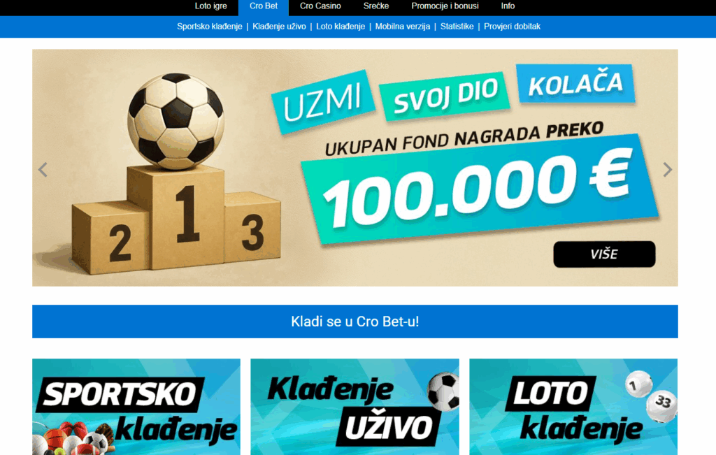Cro Bet je odjeljak za sportsko klađenje, s naglaskom na nogomet, košarku, tenis i rukomet. U ponudi su klasične single i kombinirane oklade, kao i posebna opcija loto klađenja koja povezuje sportski i lutrijski svijet.